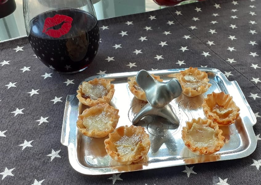 Fill each shell with the garlic/onion jam. Cover with a piece of Brie cheese.