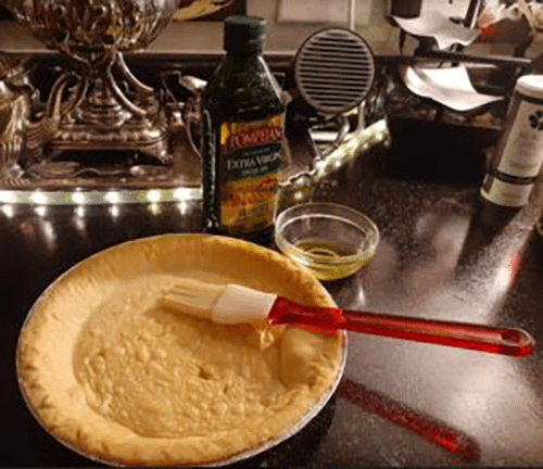 Reduce oven temperature to 350F. Brush olive oil on the bottom of the pie crust. Then sprinkle half of mozzarella on bottom of cooled pie crust.
