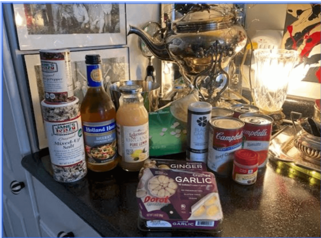 Put a bit of olive oil in a pot and cook the onions and then the pellets of garlic and ginger. Put in the 4 cans of soup, 1 cup water and all the other ingredients except the sherry and chives. Cook the soup for at least 30 minutes or longer. I then either put it in a blender or use my hand blender to mix it all up. Put in the Sherry and top with chives.