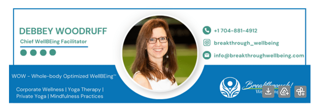 Debbey Woodruff – Your WellBEing Guide – is a certified yoga teacher and mindfulness practitioner. Through yoga therapy, mindful movement, breathwork, and guided self-reflection, Debbey helps you reconnect with your body, calm your mind, and nurture lasting emotional well-being. Experience a compassionate, personalized path to healing and renewal and find your W.O.W. – Whole-body Optimized WellBEing ©. Debbey is the owner of Breakthrough! WellBEing Phone: 704-881-4912 and email:[email protected]