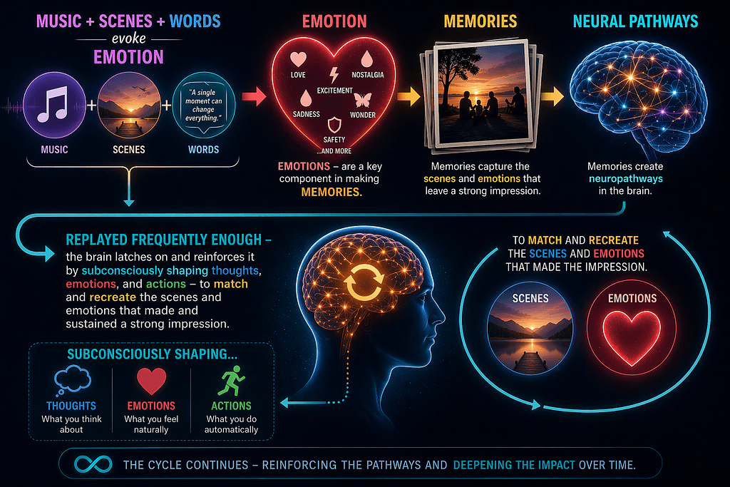 Like a powerful commercial, it creates an emotional imprint. With repetition, that imprint strengthens. Your brain recognizes the pattern as important and reinforces the neural pathways.