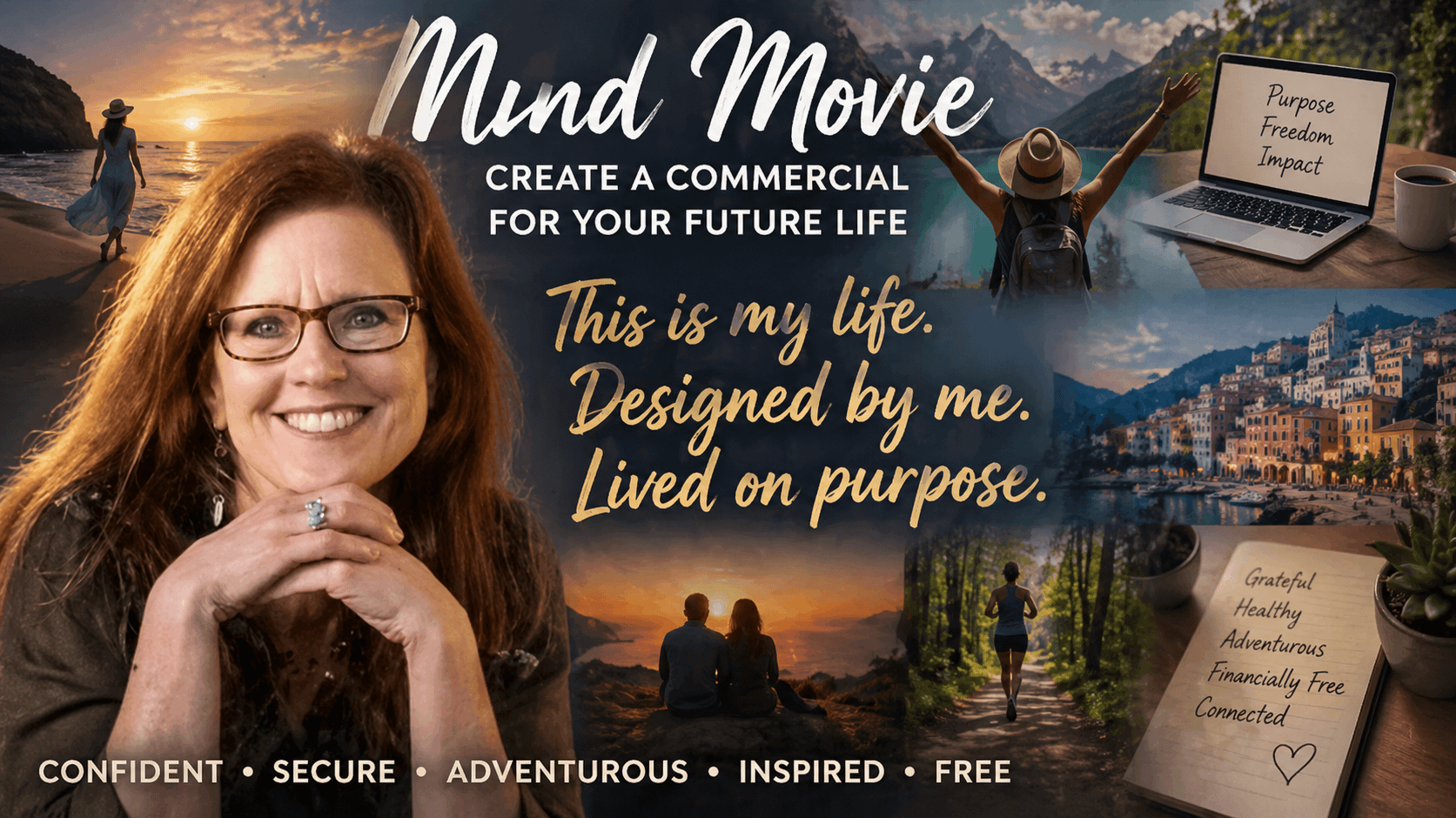 A mind movie is a multimedia vision board—think of it as a commercial for your future life. Using principles of modern marketing psychology, it pairs music with vivid three-dimensional scenes and layered words to represent the experiences, relationships, and emotions you want to create.
